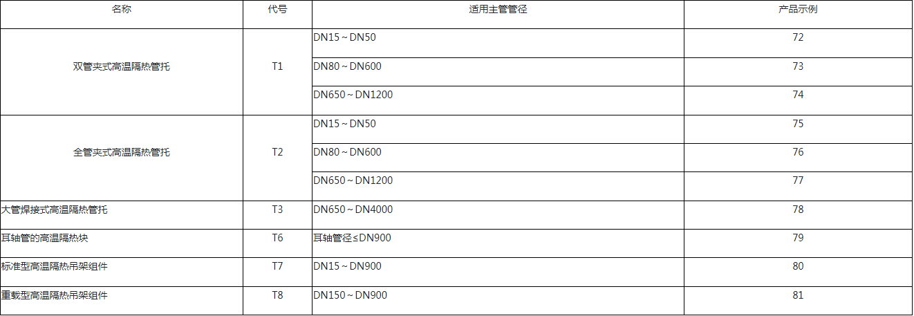 - 高温隔热管托是由使用复合保温隔热材料浇注成型硬质隔热层、硅酸铝双面针刺毯软质层与钢结构件(管夹、托座或耳轴、耳座等)组合而成。高温隔热管托主要用于高温介质传输管线的支撑或悬吊部位,以使该支撑或悬吊部位的管线与外部环境隔绝,使高温管线免受外界环境温度的影响,且具有防潮、阻燃、减振等作用。特别是它能有效避免管线热量的散失,大大降低装置运行过程中的能源消耗,是非常理想的节能管架。 参考HG/T 21629-2021,高温隔热管托的基本结构型式见表14。(因篇幅有限,T4、T5、T6、T9~T20及按其它标准图集生产的高温隔热管架未列入表中,但我公司均可根据客户需求生产,满足供应。 高温隔热管托的各项性能数据请详见附件1《支吊架技术文件》6.2.3