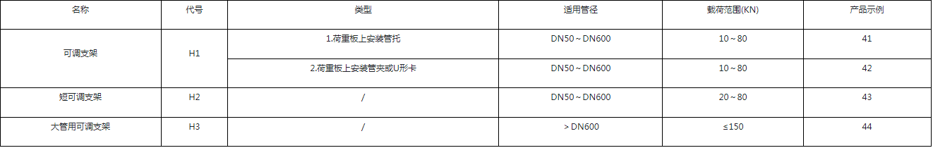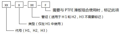 示例:H1-1-200-F表示用于支撑DN200管道、1型、带PTFE滑板的可调支架。
