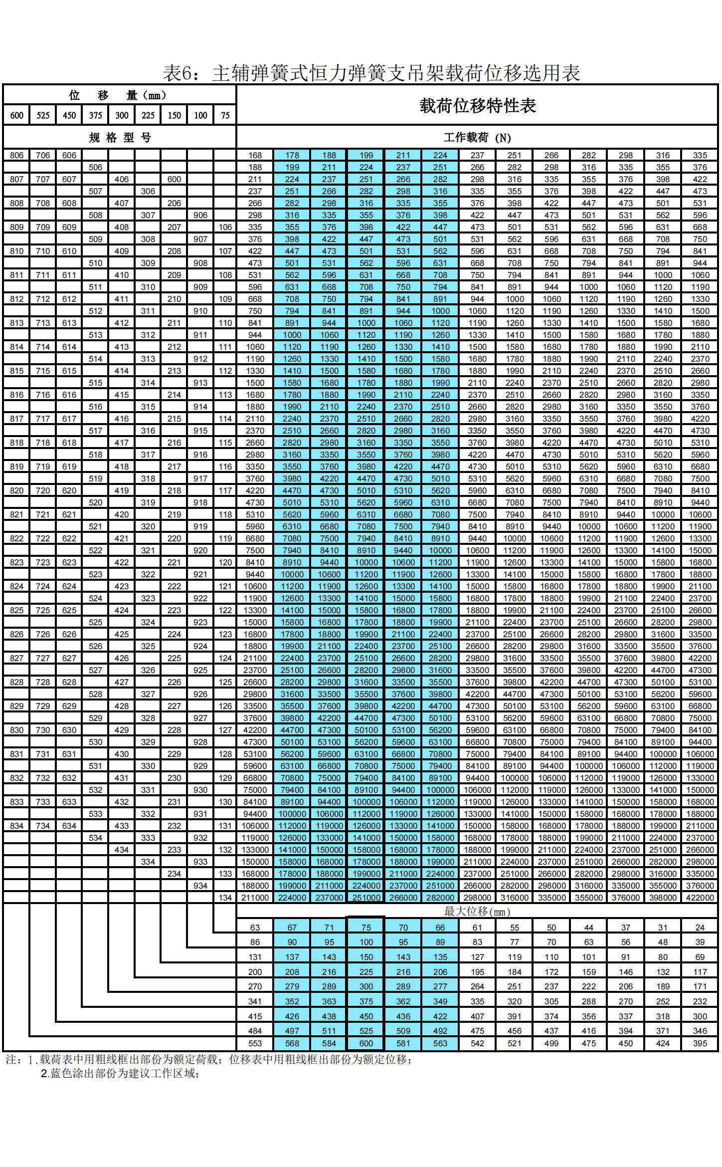 表6:主辅弹簧式恒力弹簧支吊架载荷位移选用表
